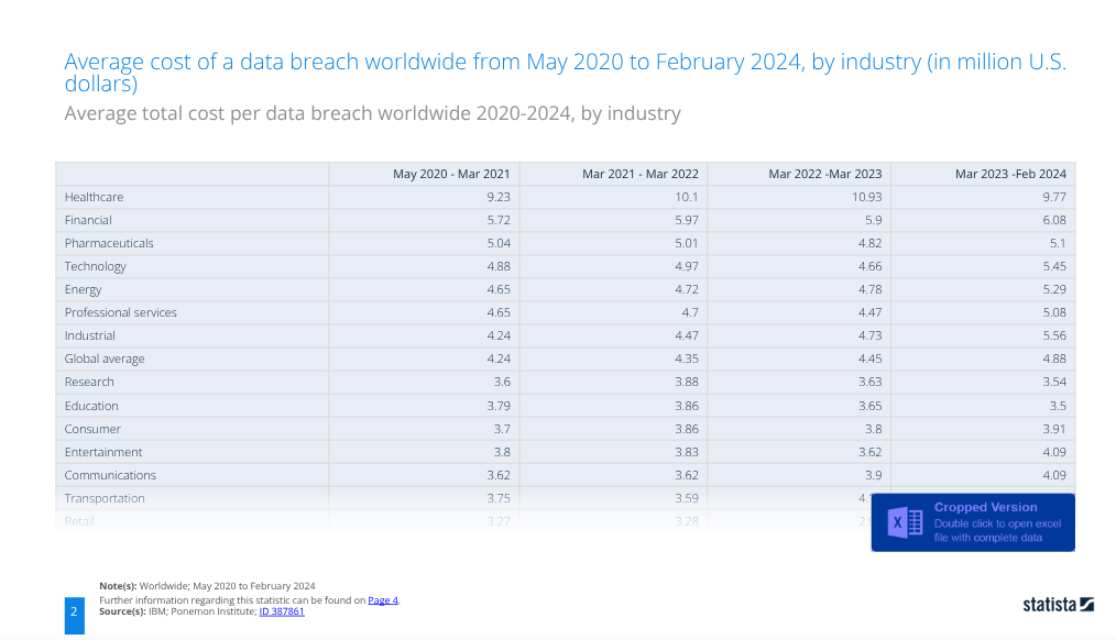 Negli ultimi anni, il settore industriale ha registrato un aumento esponenziale di attacchi hacker mirati, che includono ransomware, phishing e manipolazione dei dati operativi. Questi attacchi non solo comportano elevati costi economici, ma minacciano anche la continuità operativa e la reputazione aziendale. Da un’indagine di Statista, è emerso che nel 2023, il settore manifatturiero ha registrato la quota più alta di attacchi informatici tra i principali settori industriali a livello mondiale, subendone quasi un quarto del totale (25.7%) (img.1). Per questo motivo, le aziende hanno gradualmente aumentato gli investimenti in cybersecurity, con un budget totale che per il 2024 secondo le stime tocca solo in Italia 2,001 miliardi di euro (Rapporto annuale Anitec-Assinform “Il Digitale in Italia”). Investimenti ingenti ma necessari se si tiene conto che tra marzo 2022 e febbraio 2024, il costo medio globale delle violazioni di dati è stato di 4,88 milioni di dollari, toccando i 5,6 milioni di dollari nel comparto industriale (img.2).